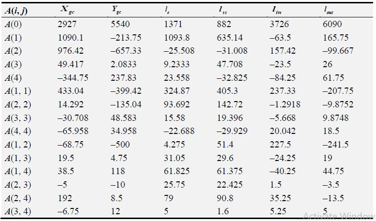 The DGCP include: f – area; Ie and In minimum and maximum moments of inertia;Iu – moment of inertia about an axis passing through the center of gravity of the cross section parallel to the axis of rotation u; φ the angle between the central axis of the minimum moment of inertia and the axis u; Χgc,Υgc the coordinates of the center of gravity;βi – stagger angle;lss – the distance from the outermost points of the edges and suction side to the axis Ε; lin, lout – the distance from the outermost points of the edges to the axis Ν; We, Wss, Win, Wout, – moments of profile resistance.