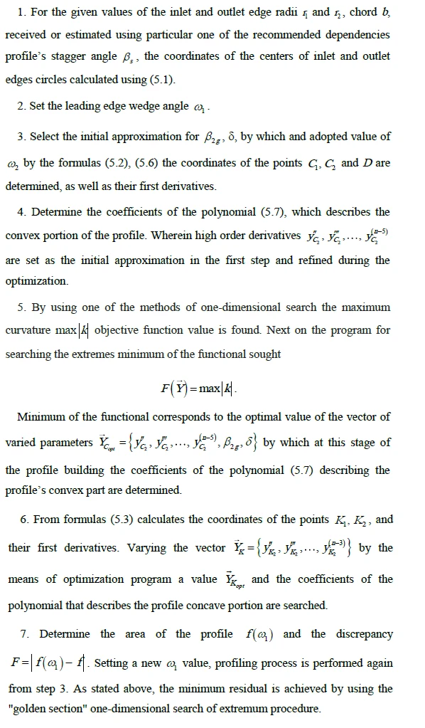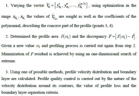 When used for the formation of the profile contour of polynomials of degree n (n > 5 for the convex part of the profile, and n > 3 for the concave part) the question arises about the correct choice of the missing n–5 (or n–3) boundary conditions which must be selected on the basis of the requirements of aerodynamic profile perfection.