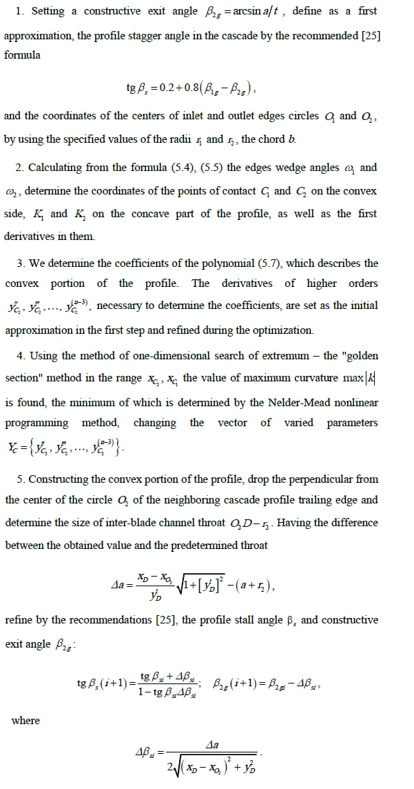 The calculation of the boundary layer can be produced by known methods of boundary layer theory [22]. There is reason to believe the boundary layer in real turbomachinery cascades fully turbulent. At least the treatment the boundary layer as turbulence do not gives low loss coefficient values in the cascades. Before values of Mach numbers M < 0.5, calculation of the boundary layer on a single cascade profile can produce satisfactory accuracy as an incompressible fluid [22]. As a possible formulas for the momentum thickness calculation can take the expression obtained in the solution of the turbulent boundary layer by L.G. Loytsyanskiy method