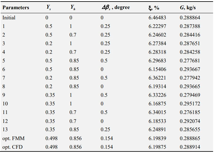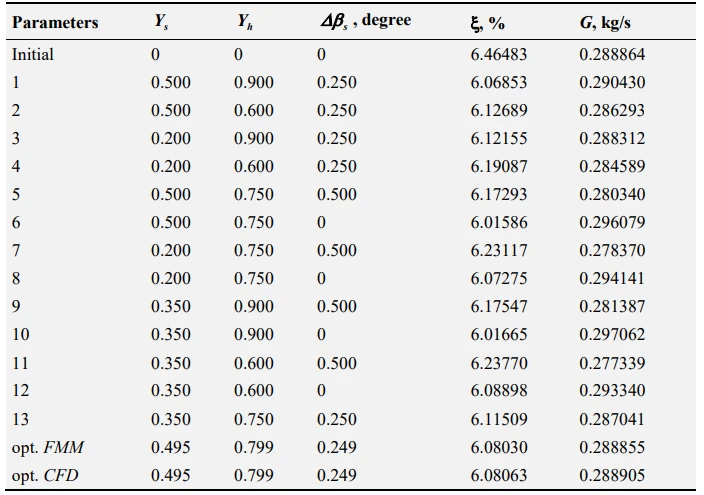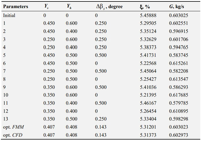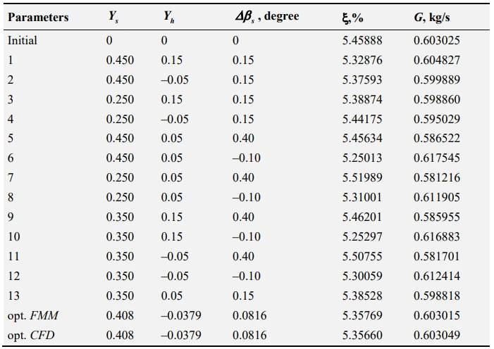 A potential imperfection of the proposed optimization approach can be precision of the obtained FMM. Checking CFD calculation of optimal variant shows that the accuracy of the FMM is high because the objective function optimal values, projected by FMM, and restriction function with high enough precision coincide with their values received as a result of CFD calculation (divergence in ζ is 0.005%, and in G – 0.017%). Differences of the mass flow rate in optimal and initial variant, based on the results of the CFD calculations, is 0.014%.