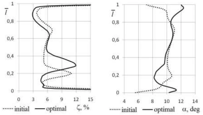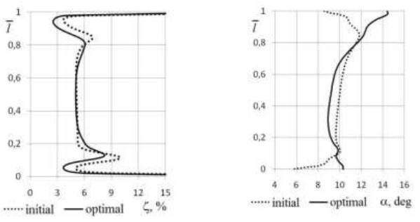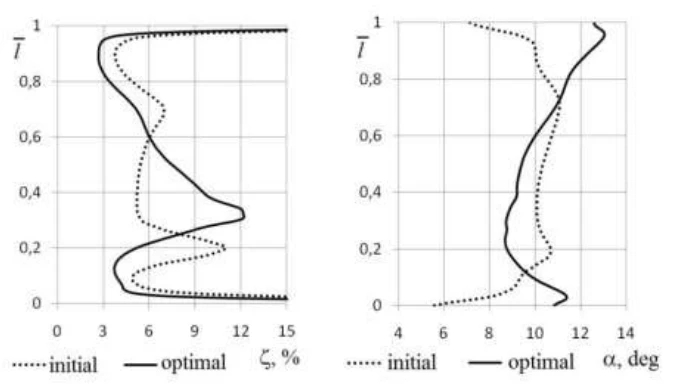 The distribution of the coefficients of losses and the actual outlet angles along the height of the blades for the initial and the optimal variants are represented at Fig. 6.27 and 6.28 respectively. These figures show that increasing of the losses in optimal variant took place in the central part of the cascade along with reduction of the losses at the end areas, while actual outlet angle, on contrary, decreased in the central part and at the end areas.