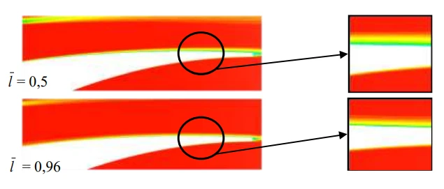 Thus, on the suction side of the blades, there are areas with variously formed boundary layers. This explains the different thickness of the boundary layer in the appropriate places on the suction side of the blade.