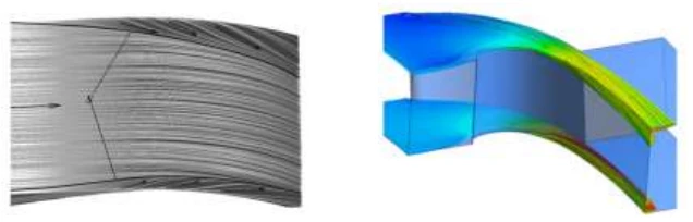 Figure 6.33 (left) Stream lines on the suction side of the initial blade. Figure 6.34 (right) Stream lines of the secondary flow of the initial blade.