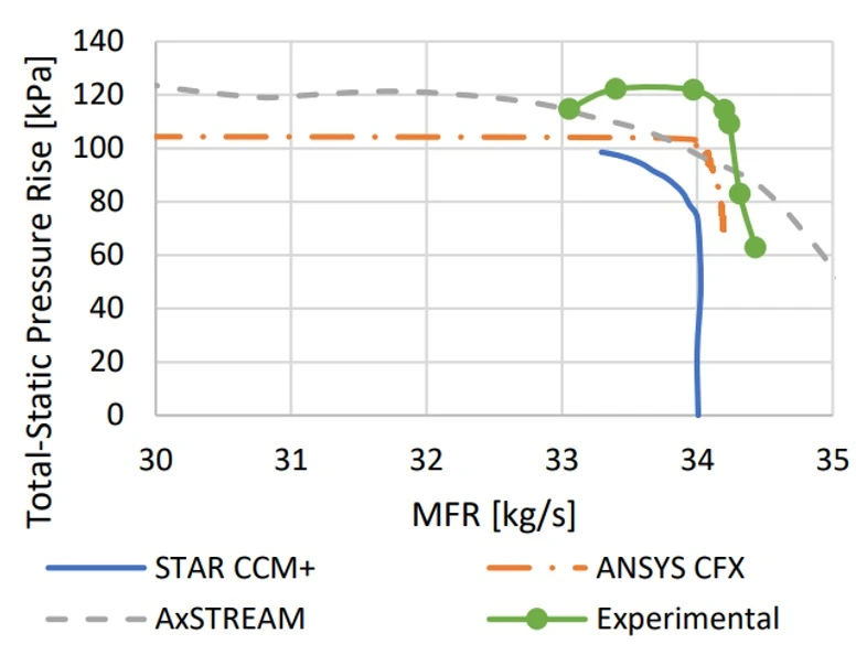 Each analysis indicated that the second stage experienced stall first. The 1D solution had a lower stall mass flow rate prediction compared to the other methods, resulting in the largest discrepancy with the experimental results. If the loss models are tuned for a specific compressor type, this could help improve the 1D stall prediction. While the accuracy of the prediction may be limited compared to CFD approaches, the 1D approach still offers significant design benefit. This stall prediction can guide an engineer’s design modifications, as it can be generated much more quickly compared to CFD predictions. While it is still good design practice to verify the compressor’s performance using CFD, this verification can take place later on in the design process.