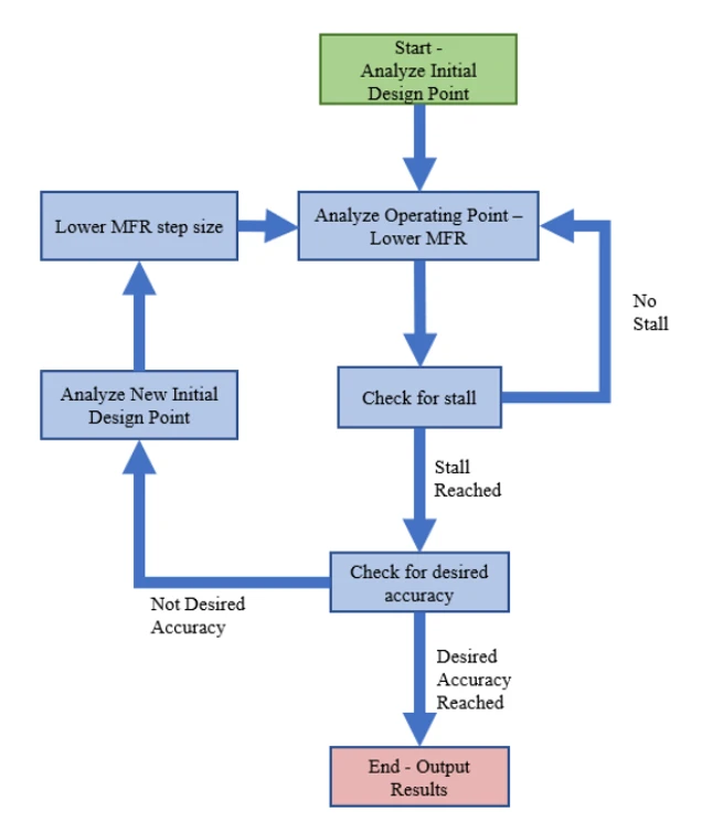 To test for this stall criterion, an automated workflow was developed using AxSTREAM ION. Several operating points can be analyzed in a single workflow, each time checking if the stall criterion is met. Since the 1D analysis for a single operating point only takes a few seconds at the most, this allows all the speedlines (including the stall points) to be calculated within a few minutes. This offers significant time savings when compared to CFD analyses of the same compressor geometry. The conceptual workflow algorithm is illustrated below.