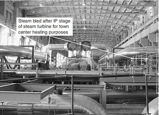 Cogeneration plants are also known as combined heat power (CHP) plants and are widely used in Europe where they provide steam heating as well as power to large city centers. Figure 3, below, is a photograph of this kind of plant where the steam is bled after the intermediate-pressure (IP) stage of a three-stage steam turbine, which consists of an high pressure HP stage, an IP stage and a low-pressure (LP) stage.