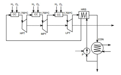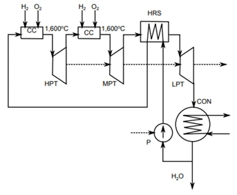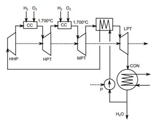 2. Proposed by Westinghouse Electric Co., by Convention Called the WESTINGHOUSE CycleThe Westinghouse cycle is a variant of the steam cycle with direct combustion of hydrogen with oxygen. Compared to the Toshiba cycle, it does not possess the turbine part used in the highest pressure region. It can be classified as a kind of new Rankine cycle with single reheat, Figure 7.