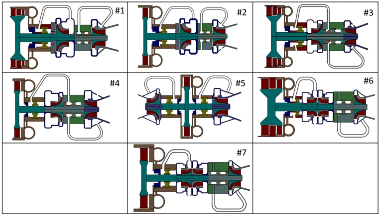 Overall seven different configurations of the turbopump were taken into account during the execution of the algorithm. The developed approach allows switching from a manual approach an automatic one, performing preliminary design steps described above for each configuration and recording crucial performance parameters for the selection of the best configuration. The configurations are presented in the picture below.