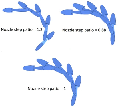 The level of losses in drilled nozzles depends on the choice of various parameters, like the angle of drilling, the throat length, the fillet radius, and others. If nozzles of this type are located in a cascade, then an interaction occurs between the supersonic flows exiting each nozzle. This phenomenon can significantly affect losses. Therefore, when developing methods for calculating losses in nozzle cascades, it is necessary to take into account the location of the nozzles (Figure 5).