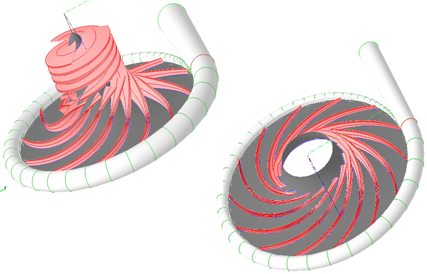 A turbopump’s secondary flow network as seen in AxSTREAM NET, with a small buffer zone (red) to prevent premature mixture.
